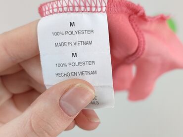Bladoróżowa koszulka damska z półtransparentnymi rękawami z siateczki. - Rozmiar: M (na metce: WOMEN M) - Krój: prosty, lekko wydłużony; okrągły dekolt - Rękawy: krótkie, z delikatnego tiulu/siate...