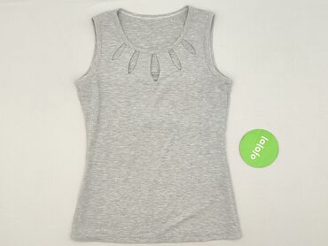 Szara damska koszulka typu tank top - Krój: bez rękawów, klasyczny dekolt okrągły, wąskie ramiączka - Materiał: miękka, elastyczna dzianina (melanż jasnoszary) - Długość: sięga poniżej bioder – wy...