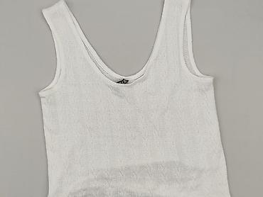 Biały top bez rękawów damski Sinsay, rozmiar S. - Fason: dopasowany, prążkowany - Dekolt: półgolf z delikatną falbanką przy krawędzi - Materiał: elastyczna dzianina prążkowana (miękka, rozciągliwa...