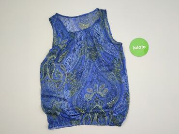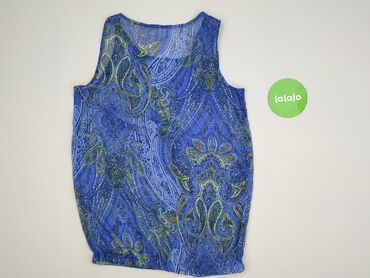 Top damski bez rękawów z lekkiego, półprzezroczystego materiału. Wzór: okręgi w odcieniach granatu, niebieskiego, bieli i złamanej żółci na drobno nakrapianym tle. Krój luźny, przewiewny, idealny n...