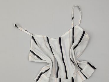 Biały top na ramiączkach - Krótki fason (crop top), dopasowany do sylwetki - Delikatne, cienkie ramiączka – jedno klasyczne, drugie skręcane - Miskowa, marszczona góra podkreślająca biust; pionowe...