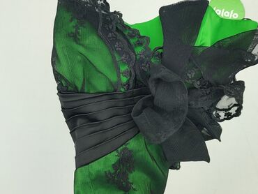 - Detale: czarna, szeroka, plisowana taśma w pasie; koronkowe aplikacje z motywem kwiatowym; prześwitująca siateczka przy dekolcie; finezyjna kokarda przy wiązaniu