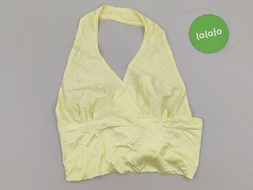 Żółty top na ramiączkach typu halter - Krój: lekko rozszerzany ku dołowi, dekolt w kształcie V z marszczeniem na środku - Ramiączka: cienkie, wiązane na szyi - Materiał: 96% wiskoza, 4% elastan – ...Stan:
