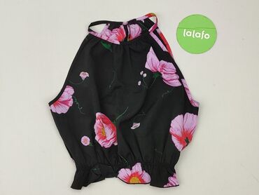 Krótki top damski marki Terranova w rozmiarze M. Charakteryzuje się krótkimi rękawami i głębokim dekoltem w kształcie litery V. Wzór w czarno-białe nieregularne kwiaty dodaje mu unikatowego charakt...