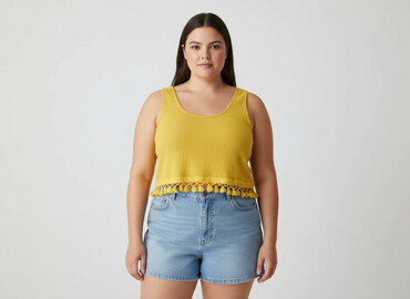 Damski krótki top na ramiączkach w intensywnym żółtym kolorze. Top charakteryzuje się okrągłym dekoltem i szerokimi ramiączkami, zapewniającymi komfort noszenia. Dół topu ozdobiony jest ozdobną kor...
