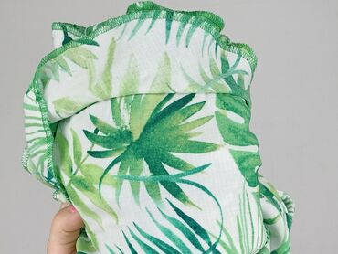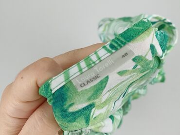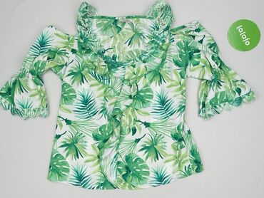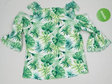 Rękaw 3/4Bluzka damska z odkrytymi ramionami, charakteryzująca się wzorem w zielone liście, przypominające monstery i paprocie, na białym tle. Posiada falbanki wokół dekoltu i na ramionach, dodające jej lekkości i dziewczęcego uroku. Rękawy rozszerzają się ku dołowi, tworząc modny fason dzwonów. Wykończenie brzegów rękawów jest faliste, co harmonizuje z resztą wzoru i dodaje oryginalności. Top marki Laura Torelli, linia Classic, rozmiar 40. Idealny na letnie dni, wakacje czy casualowe wyjścia.