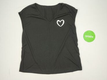Czarna damska koszulka z krótkim rękawem i okrągłym dekoltem. Z przodu nadruk w kolorze jasnego różu: serce z liniami oraz kompozycja koniczynek/kwiatków po prawej stronie. Tył gładki bez nadruku. ...