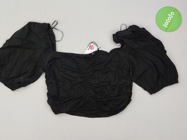 Czarny krótki top damski z długim rękawem - Fason: crop top, okrągły dekolt, długie rękawy zakończone szerokimi mankietami - Dół z elastyczną gumką – lekko marszczony, dobrze dopasowuje się do syl...