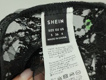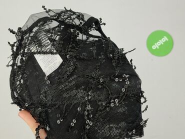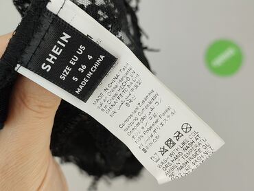 Czarny crop top SHEIN z krótkim rękawem i okrągłym dekoltem. Przód zdobiony dużą aplikacją z błyszczących cyrkonii – motyw serca z płomieniami/skrzydłami. Gładki tył. - Rozmiar z metki: XS (EU 34,...Czarny top SHEIN – koronkowa siateczka z cekinami