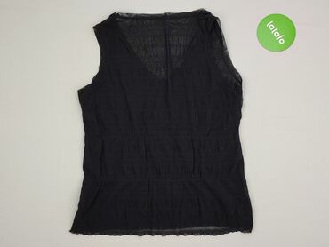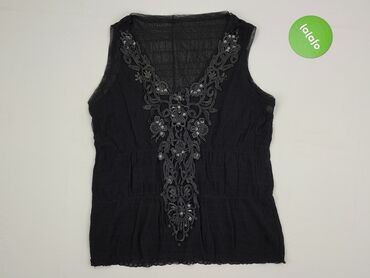 Czarna bluzka bez rękawów z ozdobnymi cekinami - Fason: luźny, lekko rozkloszowany dół, podwójna warstwa materiału u dołu - Dekolt: półokrągły z wycięciem łezką z tyłu i zapięciem na guzik - Ozdob...Stan: