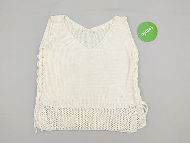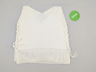 Biały koronkowy top damski - Fason: dopasowany, bez rękawów, z głębszym dekoltem w kształcie litery V z przodu i z tyłu - Wykończenie: szerokie, falowane lamówki przy ramionach i u dołu; całość z ...