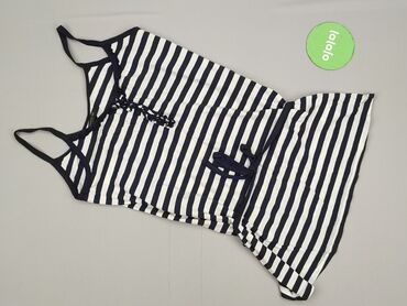Bluzka damska w paski - Krój: luźna, lekko marszczona przy dekolcie i na dole, bez rękawów (szerokie ramiączka). - Wzór: poziome pasy granatowo-białe w stylu marynistycznym. - Dekolt: okrągły, z e...