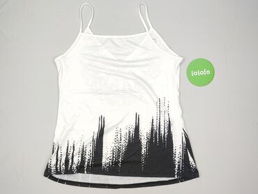 Biała koszulka na ramiączkach NEW STYLE, rozmiar L. - Krój: top na cienkich ramiączkach, prosta linia, okrągły dekolt. - Przód: nadruk „Flakey 56” z niebieskimi cyframi, różowym kwiatem i drobnymi...