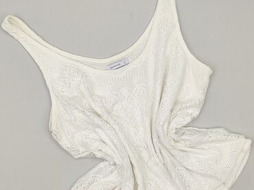 Top damski RESERVED, rozmiar XS. - Kolor: biały - Krój: bez rękawów, okrągły dekolt - Przód zdobiony licznymi sznureczkami/frędzlami tworzącymi dekoracyjny motyw - Tył gładki, lekko prześwitujący -...Stan: