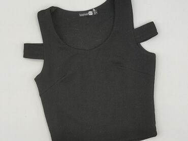 Czarny top typu crop - Krój: krótki, dopasowany, na szerokich ramiączkach, okrągły dekolt - Materiał: prążkowana dzianina – 93% poliester, 7% elastan (rozciąga się i dobrze przylega) - Rozmiar z m...