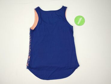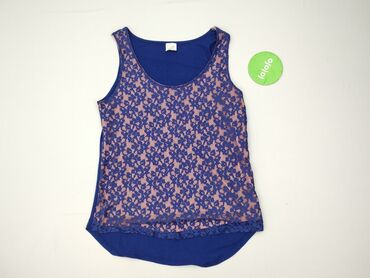Bluzka damska bez rękawów - Kolor: jasny błękit w drobne prążki - Krój: dopasowany, dekolt w serek - Ozdoby: koronkowa siateczka na ramionach i górnej części pleców z kwiatowym wzorem; rząd dekora...Stan: