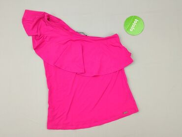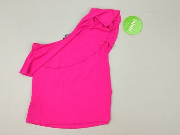 InnyDamski top Mohito Collection w intensywnym, fuksjowym kolorze. Charakteryzuje się asymetrycznym fasonem na jedno ramię, ozdobionym elegancką falbaną, która dodaje lekkości i kobiecego uroku. Ten unikatowy krój sprawia, że top jest idealnym wyborem na specjalne okazje, jak i na letnie wyjścia. Wykonany z elastycznego materiału, zapewnia komfort noszenia i dopasowanie do sylwetki. Na dole widoczna jest subtelna metalowa aplikacja z logo marki, podkreślająca autentyczność produktu. Idealny do łączenia zarówno z eleganckimi spodniami, jak i casualowymi szortami.