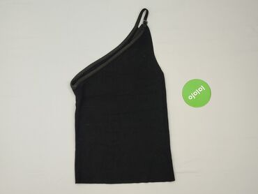 Czarna bluzka damska bez rękawów, wykonana z prążkowanej dzianiny, charakteryzująca się asymetrycznym krojem z jednym odkrytym ramieniem i subtelnie wyciętym dekoltem. Fason crop top. Uniwersalny e...