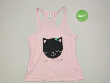 OkrągłyDamski top na ramiączkach w kolorze pudrowego różu, marki Forever 21, rozmiar M. Przód zdobi duży nadruk przedstawiający czarnego kota z zielonym kwiatkiem na uchu. Pod nadrukiem znajduje się napis "BAD LUCK CHARM". Top posiada fason bokserki z tyłu, co zapewnia swobodę ruchów. Wykonany jest z mieszanki 51% bawełny i 49% modalu, co gwarantuje miękkość i wygodę noszenia. Idealny na co dzień, na lato lub jako element stroju sportowego.