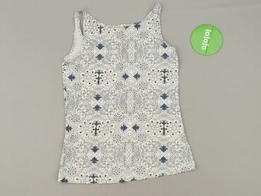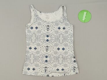 Biała damska koszulka bez rękawów (tank top) Esmara. - Rozmiar na metce: S (EU 36/38, GB 8/10, FR 38/40, ES/IT/PT 38/40) - Krój: klasyczny tank top z szerokimi ramiączkami i okrągłym dekoltem - Dz...Damski top na ramiączkach w kolorze białym z granatowym wzorem, wykonany z 95% bawełny i 5% elastanu, co zapewnia wygodę i elastyczność. Top posiada okrągły dekolt i jest idealny do noszenia na co dzień w cieplejsze dni lub jako baza pod inne ubrania.