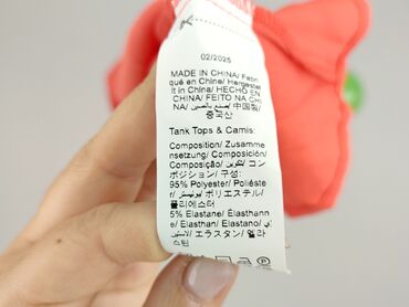 Top damski SHEIN, krótki/cropped, bez rękawów. - Kolor: biały z pomarańczowym nadrukiem w formie kolażu prostokątów - Krój: dopasowany, krótki top z okrągłym dekoltem - Materiał: 95% poliester, 5%...