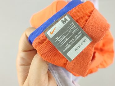 OkrągłyTop damski marki Nike, idealny do aktywności fizycznej lub na co dzień. Charakteryzuje się pomarańczowym kolorem z białymi ramiączkami i niebieskim paskiem. Na piersi znajduje się subtelne logo Nike w kolorze niebieskim. Lekki i wygodny, zapewnia swobodę ruchów. Wykonany w technologii NikeFIT DRY, która odpowiada za utrzymanie suchości i komfortu podczas wysiłku. Rozmiar M, odpowiedni dla wzrostu 165 cm. Wyprodukowany w Kambodży.