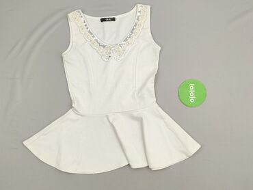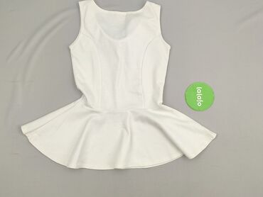 Biała bluzka bez rękawów z baskinką, rozmiar XS/S. - Materiał elastyczny, miękko układający się, z wyraźną fakturą (wypukłe kropki i drobne cekiny nadają delikatny połysk). - Okrągły dekolt, dopa...