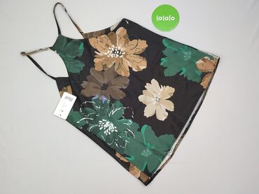 Czarny damski top z nadrukiem w kwiatowy wzór. Posiada okrągły dekolt i szerokie ramiączka, co zapewnia wygodę noszenia. Dolna część topu wyróżnia się głębokim wycięciem w kształcie litery „V” z pr...Stan: