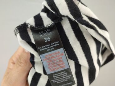 Top bez ramiączek F&F - Krój: bandeau/tube top - Wzór: czarno‑białe, poziome paski - Rozmiar z metki: EU 36 / UK 8 - Obwód klatki piersiowej wg metki: 85 cm - Materiał: 95% bawełna, 5% elastan – m...Top damski w czarno-białe paski, idealny do różnych stylizacji. Wykonany w 100% z bawełny, co zapewnia komfort noszenia i przewiewność. Prosty fason bez ramiączek sprawia, że jest to uniwersalny element garderoby, który dobrze sprawdzi się zarówno na co dzień, jak i podczas letnich wyjść. Można go prać w pralce w temperaturze 30 stopni. Dostępny w rozmiarze 36.