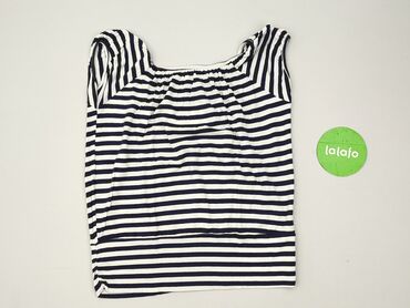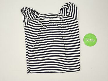 Bluzka damska w paski - Fason: luźny, z lekko obniżoną linią ramion - Dekolt: w serek z przodu, okrągły z tyłu - Rękaw: do łokcia/3/4 - Wzór: pionowe pasy w kolorze granatowym i białym - Materiał:...