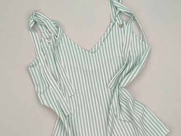 Bluzka damska na ramiączkach, w drobne biało‑niebieskie prążki. - Krój: hiszpański/cold shoulder – cienkie ramiączka + krótkie, falujące rękawki odsłaniające ramiona - Dekolt: lekko w kształcie V ...Stan: