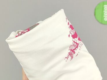 Damska koszulka z krótkim rękawem - Kolor bazowy: biały - Dekolt: okrągły - Przód zdobiony dużym, abstrakcyjnym motywem w odcieniach fuksji i czerni z efektem „pęknięć” - Dodatkowe zdobienia: apli...