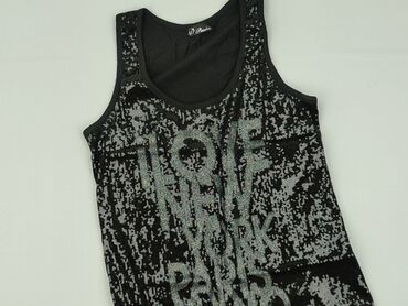 Czarna bluzka damska bez rękawów z cekinami, rozmiar S/M - Fason: dopasowany top bez ramiączek/rękawów, z szerokim elastycznym ściągaczem u dołu - Przód i boki pokryte gęstymi cekinami (małe okrąg...