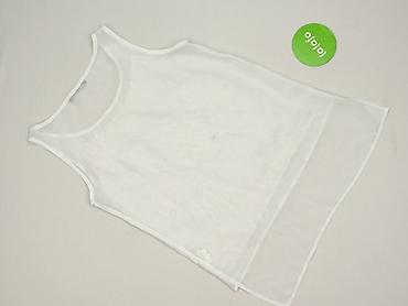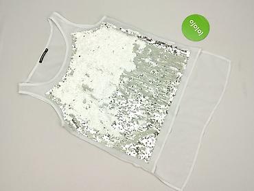 Biała damska koszulka bez rękawów z delikatnym połyskiem - Fason: lekko luźny top bez rękawów, zaokrąglony dekolt - Przód: półprzezroczysty panel z pionowymi pasami z drobnych cekinów, subtelnie p...