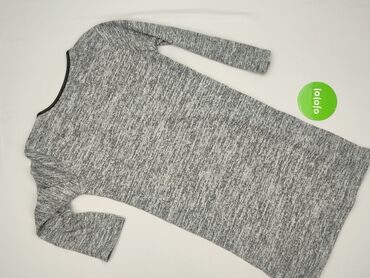 Sukienka damska z długim rękawem, dzianinowa, szaro‑biały melanż z kolorowymi aplikacjami - Fason: prosta, lekko dopasowana, długość przed kolano - Rękawy: długie - Dekolt: okrągły, obszyty koloro...