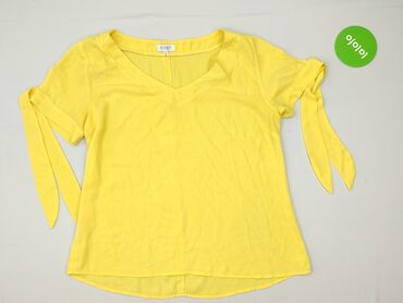 Żółta bluzka damska z krótkim rękawem - Kolor: intensywny żółty - Fason: dopasowany, lekko taliowany - Dekolt: w serek (V-neck) z marszczeniem i ozdobnym kółkiem z koralikami na środku - Rękawy: k...Stan: