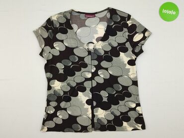W serekTop damski z krótkim rękawem, w odcieniach czerni, szarości i beżu, zdobiony wzorem w owalne kształty. Dekolt w kształcie litery V, z ozdobnym, okrągłym elementem na środku. Idealny na co dzień, do pracy lub na spotkania towarzyskie.