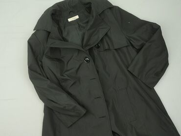 Czarny damski płaszcz/trencz z lekkiej, połyskującej tkaniny syntetycznej. - Długość do połowy uda. - Klasyczne szerokie klapy. - Zapięcie na cztery guziki z przodu (dwurzędowe w układzie 2+2). ...