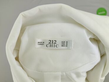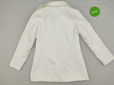 Biały damski żakiet bez zapięcia - Krój: krótki, lekko taliowany, z pionowymi przeszyciami modelującymi sylwetkę - Rękawy: długie - Dekolt: otwarty, bez kołnierza - Zapięcie: brak – luźno układają...