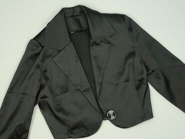Krótki bolerko/żakiecik damski - Kolor: czarny, satynowy połysk - Krój: krótkie bolerko z krótkim rękawem, szeroki kołnierz/szala, wykrojony przód bez zapięcia - Rozmiar z metki: 34 - Skład materi...