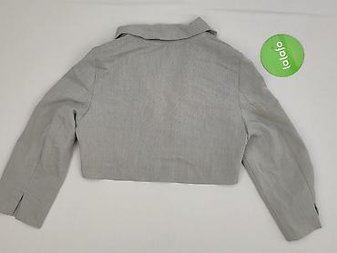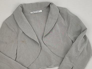 - Krój: krótszy bolerko/żakiet, bez zapięcia, z miękkimi, zaokrąglonymi klapami