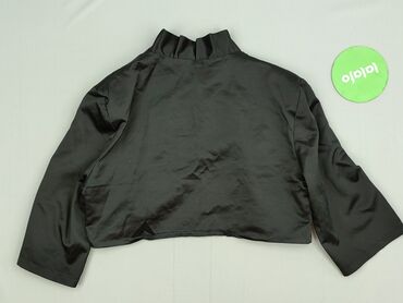 Krótki bolerko/żakiecik damski - Kolor: czarny, satynowy połysk - Krój: krótkie bolerko z krótkim rękawem, szeroki kołnierz/szala, wykrojony przód bez zapięcia - Rozmiar z metki: 34 - Skład materi...