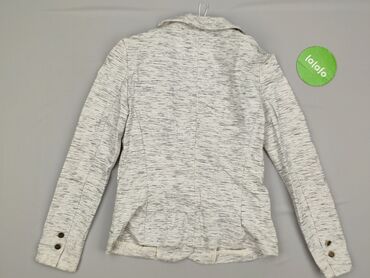 Szary żakiet damski - Krój: klasyczny, jednorzędowy z klapami, zapinany na 1 guzik - Kolor: jasny szary melanż - Materiał: 65% poliester, 35% bawełna – miękki, elastyczny dżersej - Rozmiar z metki...