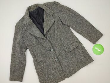 Szary żakiet/marynarka damska, rozmiar L. - Klasyczny krój z klapami w szpic - Zapinanie z przodu na 2 guziki - Dwie kieszenie z przodu typu listewka - Długi rękaw, przy mankietach po 3 dekoracyjn...