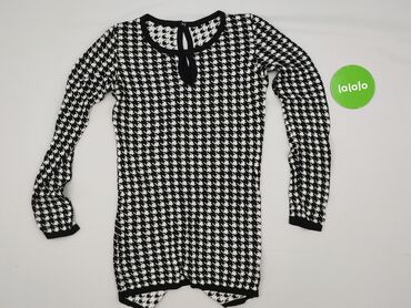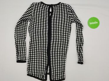 Bluzka damska z długim rękawem, wzór drobnej pepitki (czarno-biała). - Fason: luźny, lekko opadający - Dekolt: w kształcie litery V, kontrastowa czarna lamówka - Rękawy: długie, lekko bufiaste z s...