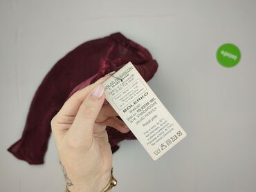 Fuksjowe bolerko damskie o połyskującym wykończeniu, idealne do uzupełnienia wieczorowych stylizacji. Fason z krótkim rękawem i podwyższonym kołnierzem dodaje elegancji. Bolerko jest rozcięte z prz...Stan: