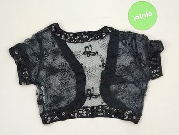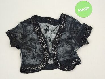 Bolero damskie, krótkie, czarne - Krój: bolerko z otwartym przodem, lekko zaokrąglone poły, krótki rękaw - Rozmiar: M (metka widoczna na zdjęciu) - Materiał: gładka, lekko połyskująca tkanina o sa...