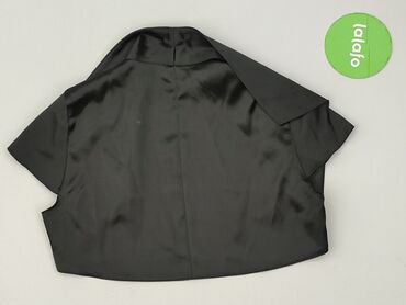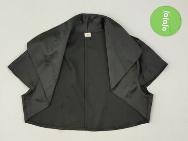 Bolero damskie, krótkie, czarne - Krój: bolerko z otwartym przodem, lekko zaokrąglone poły, krótki rękaw - Rozmiar: M (metka widoczna na zdjęciu) - Materiał: gładka, lekko połyskująca tkanina o sa...