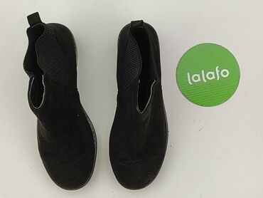 Czarne botki damskie typu Chelsea - Klasyczny fason z migdałowym noskiem - Cholewka z miękkiego zamszu/eko-zamszu - Elastyczne wstawki po bokach ułatwiające zakładanie - Niski obcas słupek ok. 3 c...Stan: