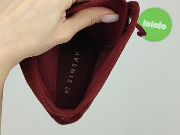 Wygodne, stabilne botki na słupku w modnym bordowym odcieniu, idealne do jeansów i sukienek. Marka i rozmiar widoczne na wkładce: Sinsay 40. Na podeszwie piktogramy materiałów.